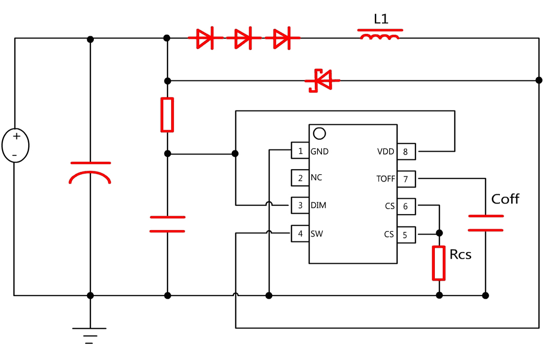 調(diào)光腳,支持PWM調(diào)光和線性調(diào)光;DIM接地則關(guān)斷輸出,DIM電壓高過3.0V則電流100%輸出 |