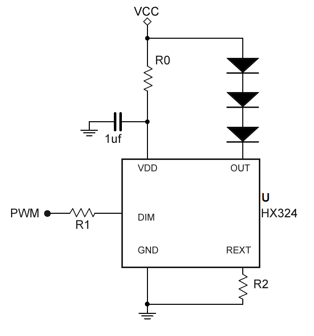 芯片的VCC電壓范圍為5~40V,低壓差驅(qū)動,使得HX324能夠在寬驅(qū)動電壓范圍內(nèi)提供穩(wěn)定的電流輸出。HX324外圍元件少,應(yīng)用可靠性好。